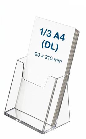 Az 1/3 A4 (DL) méretű asztali szórólaptartó elegáns és praktikus megoldás prospektusok, menük vagy termékleírások kihelyezésére.